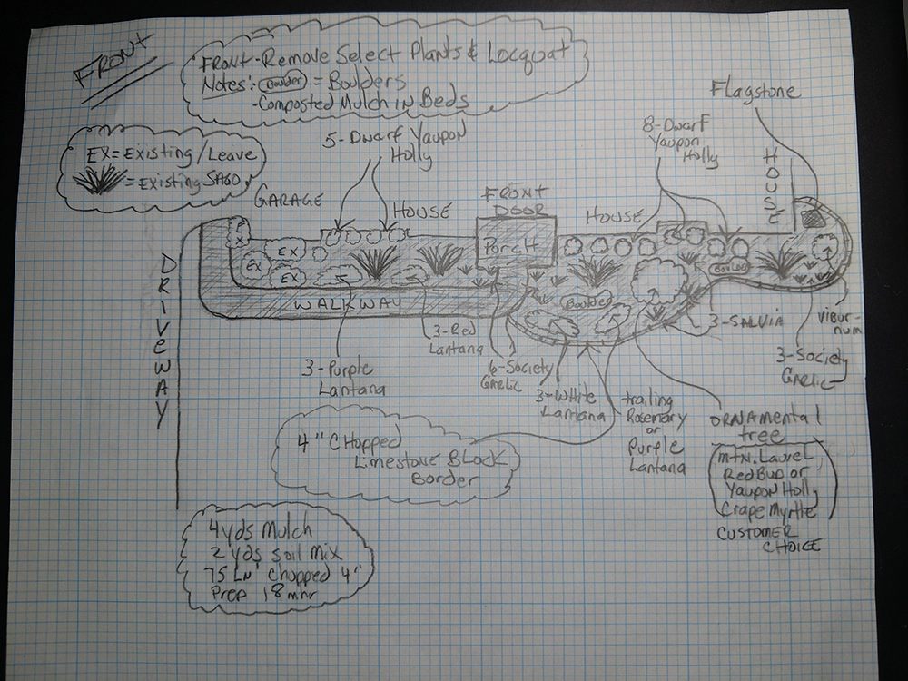 - ITEMIZED COST ESTIMATE (for us to install landscape.)* WE WILL LEAVE BOTH THE DESIGN AND COST ESTIMATE WITH YOU. ONCE YOU HAVE THOSE, YOU CAN BID THE PROJECT OUT OR DO IT YOURSELF IF YOU PREFER. THE DESIGN AND ITEMIZED PRICE LIST ARE YOURS TO DO WITH AS YOU WILL. OF COURSE, YOU CAN USE US IF THAT’S YOUR PREFERENCE